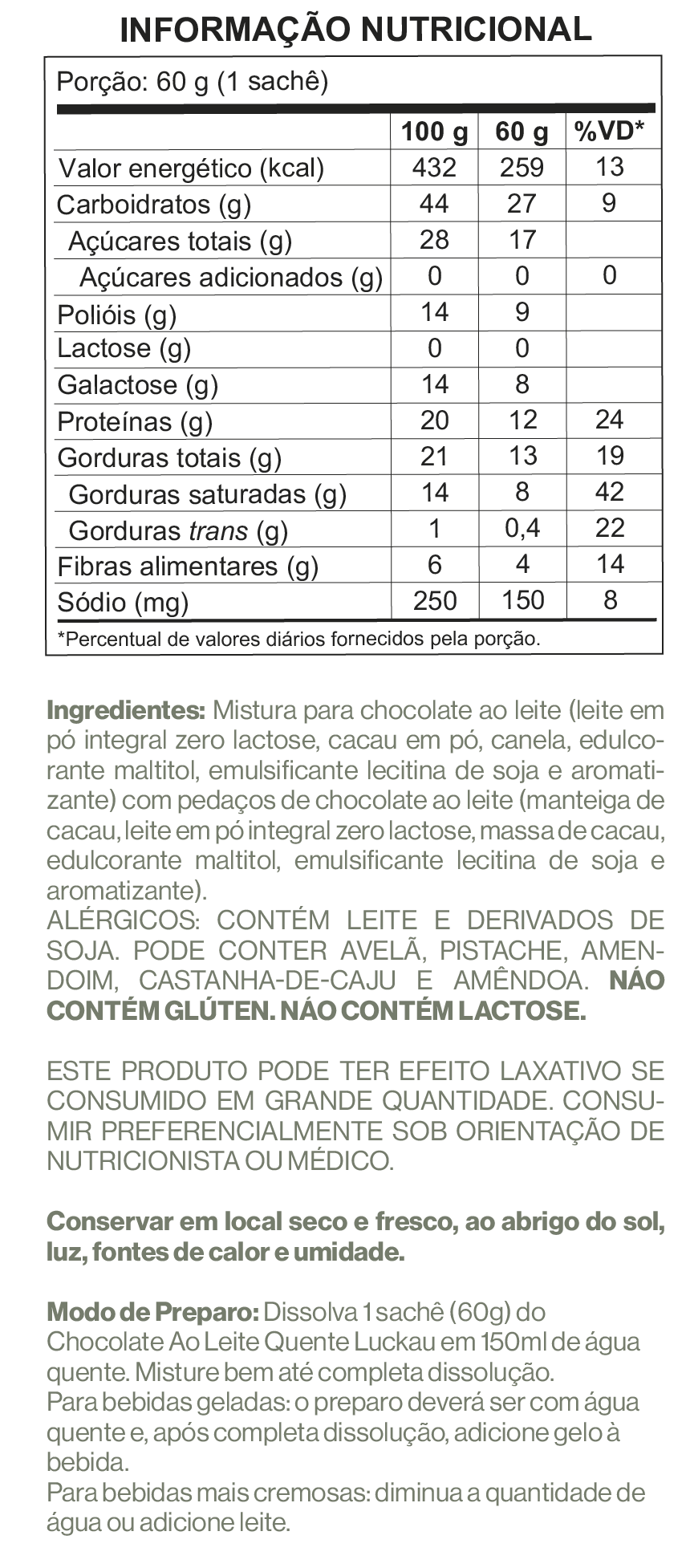 Dissolva 1 sachê (60g) do Chocolate Ao Leite Quente Luckau em 150ml de água quente.