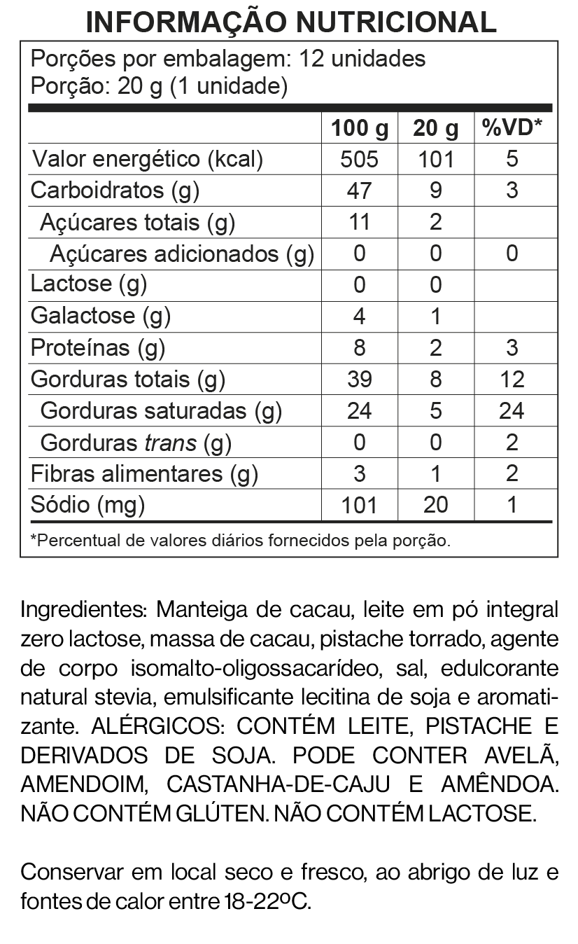 Este display contém 12 barras de chocolate ao leite com pedaços de pistache em sua versão de 20g.